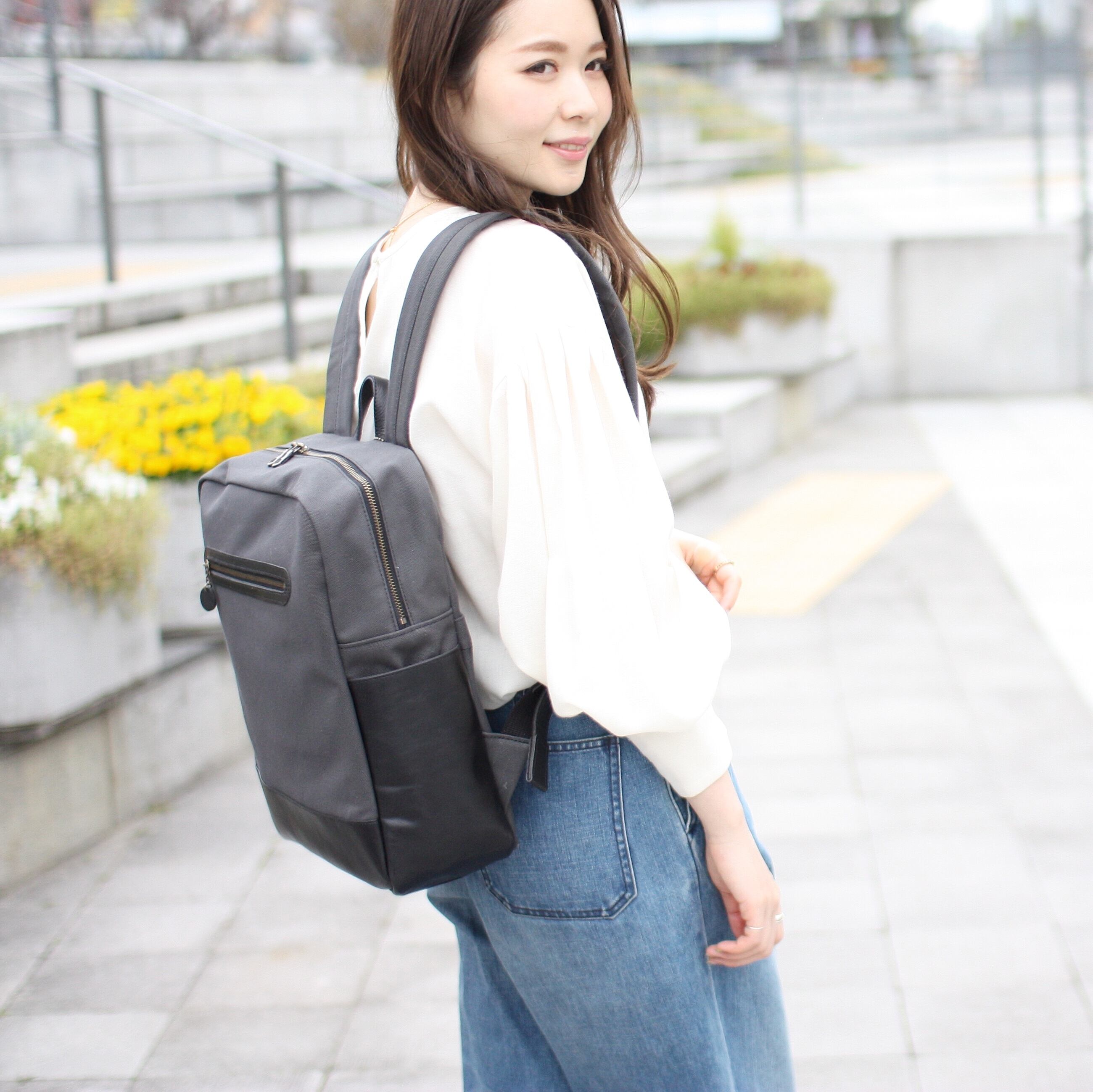 レザーに負けない帆布の上質感が、異素材ミックスのバランスを整え、カジュアル感の中にも大人の遊びを感じるオシャレなリュック。
